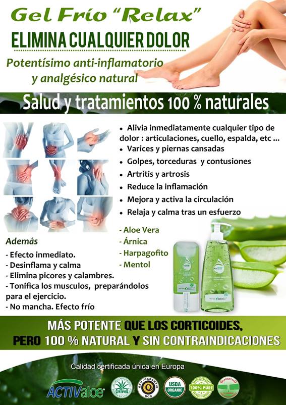 El gel frío relax Exialoe, resulta útil en el tratamiento del síndrome de piernas cansadas, proporcionando un notable alivio y agradable sensación de frescor, relajación y descanso. Su aplicación produce igualmente una sensible mejora en procesos articulares, dolores de espalda y cuello, como así también en el tratamiento local de las artrosis, al tiempo que activa el riego sanguíneo de las zonas afectadas.Anúnciate como profesional o empresa y promociona todo tu catálogo de productos/servicios. Puedes ver los ...