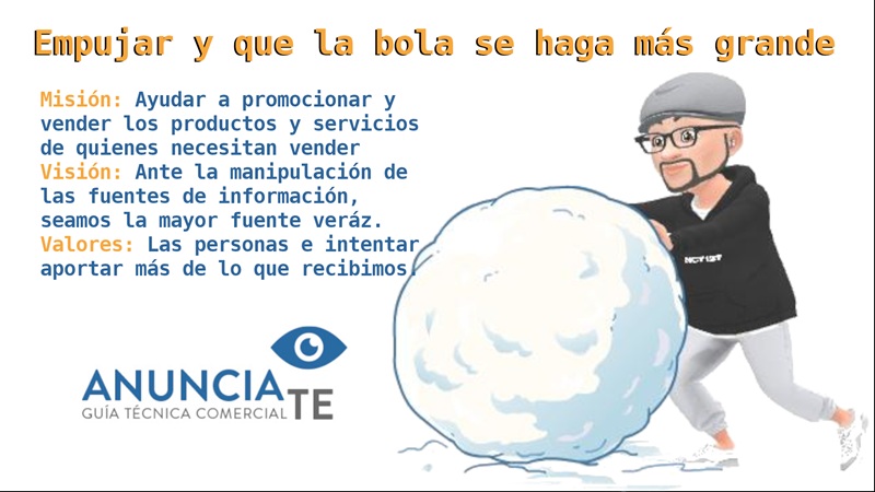 Empujar y ayudar a que la bola se haga más grande. Misión Ayudar a promocionar y vender los productos y servicios de quienes necesitan vender. Visión Ante la manipulación de las fuentes de información, seamos la mayor fuente veráz. Valores Las personas e intentar aportar más de lo que recibimos